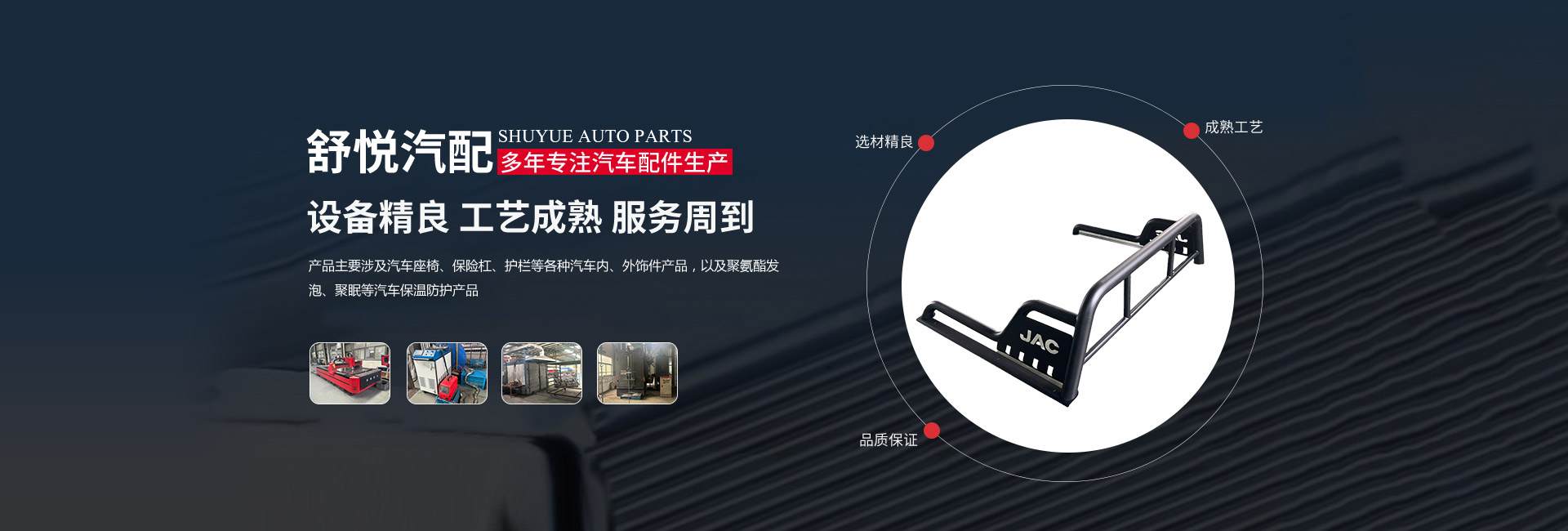 揚州舒悅汽配有限公司經(jīng)過多年的穩(wěn)定發(fā)展,業(yè)績一直蒸蒸日上。公司產(chǎn)品主要涉及汽車座椅、保險杠、護(hù)欄等各種汽車內(nèi)、外飾件產(chǎn)品,以及聚氨酯發(fā)泡、聚脲等汽車保溫防護(hù)產(chǎn)品。其主要是為江淮、金龍,奇瑞等公司服務(wù),已連續(xù)多年成為江淮、金龍等公司的A級供應(yīng)商。        公司成立于1997年,現(xiàn)坐落于揚州市儀征劉集盤古工業(yè)集中區(qū)202號,公司占地面積26640平 方米,廠房建筑面積18512平方米。公司擁有先進(jìn)的制造設(shè)備、可靠的生產(chǎn)工藝、完善的檢測手段和科學(xué)的管理,在售前和售后服務(wù)中做到快速反應(yīng),應(yīng)急應(yīng)變,為客戶提供優(yōu)良產(chǎn)品和滿意服務(wù)。公司的產(chǎn)品開發(fā)能力和生產(chǎn)規(guī)模在同行業(yè)中處于前列的地位。        揚州舒悅?cè)吮小罢\信雙嬴”的原則,發(fā)揚“誠信、務(wù)實、創(chuàng)新、貢獻(xiàn)”的企業(yè)精神,恪守“顧客至上”的經(jīng)營宗旨,致精從業(yè),不斷引進(jìn)新技術(shù)、新材料。以優(yōu)良的產(chǎn)品、合理的價格和周到的服務(wù)參與市場競爭。公司愿與國內(nèi)外朋友建立真誠的合作伙伴關(guān)系,攜手共創(chuàng)輝煌!